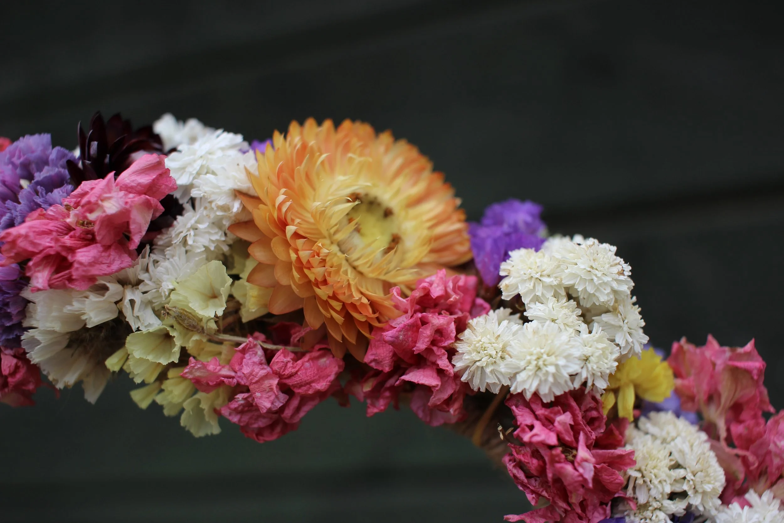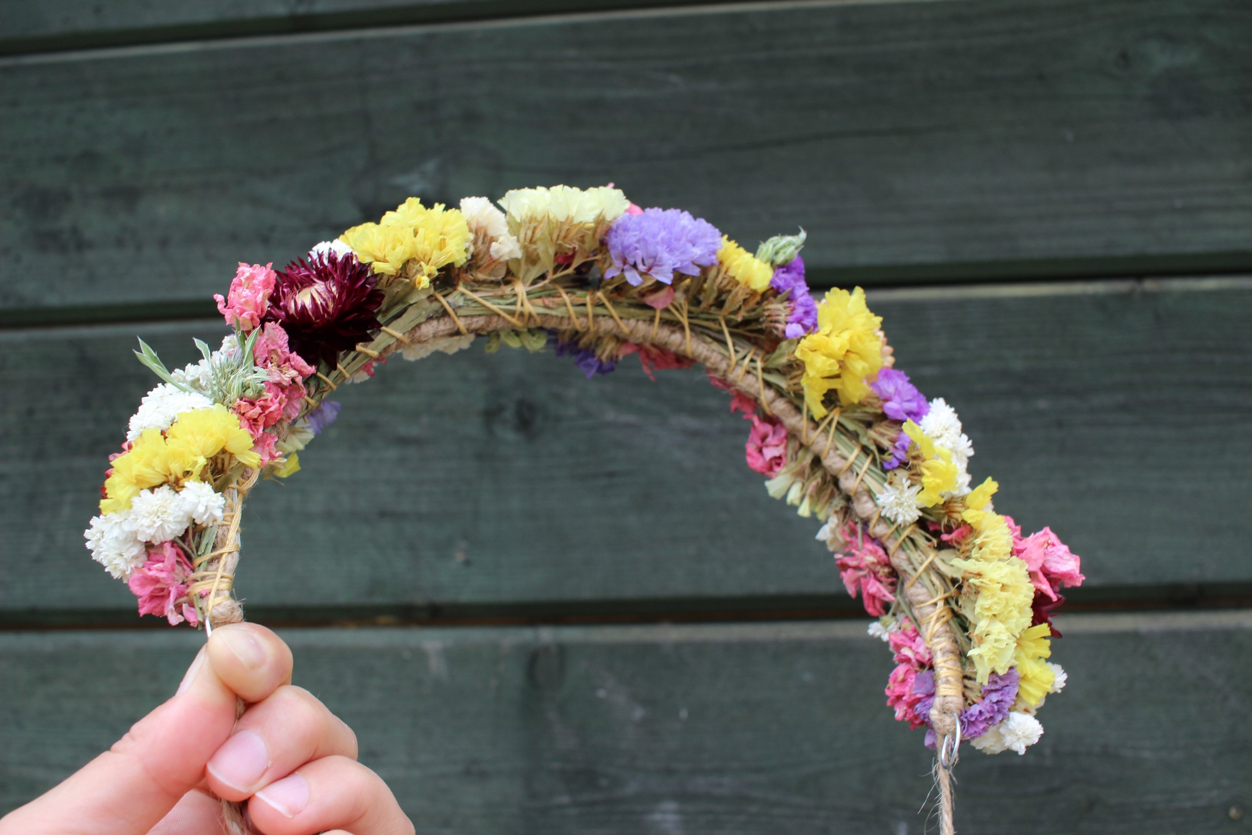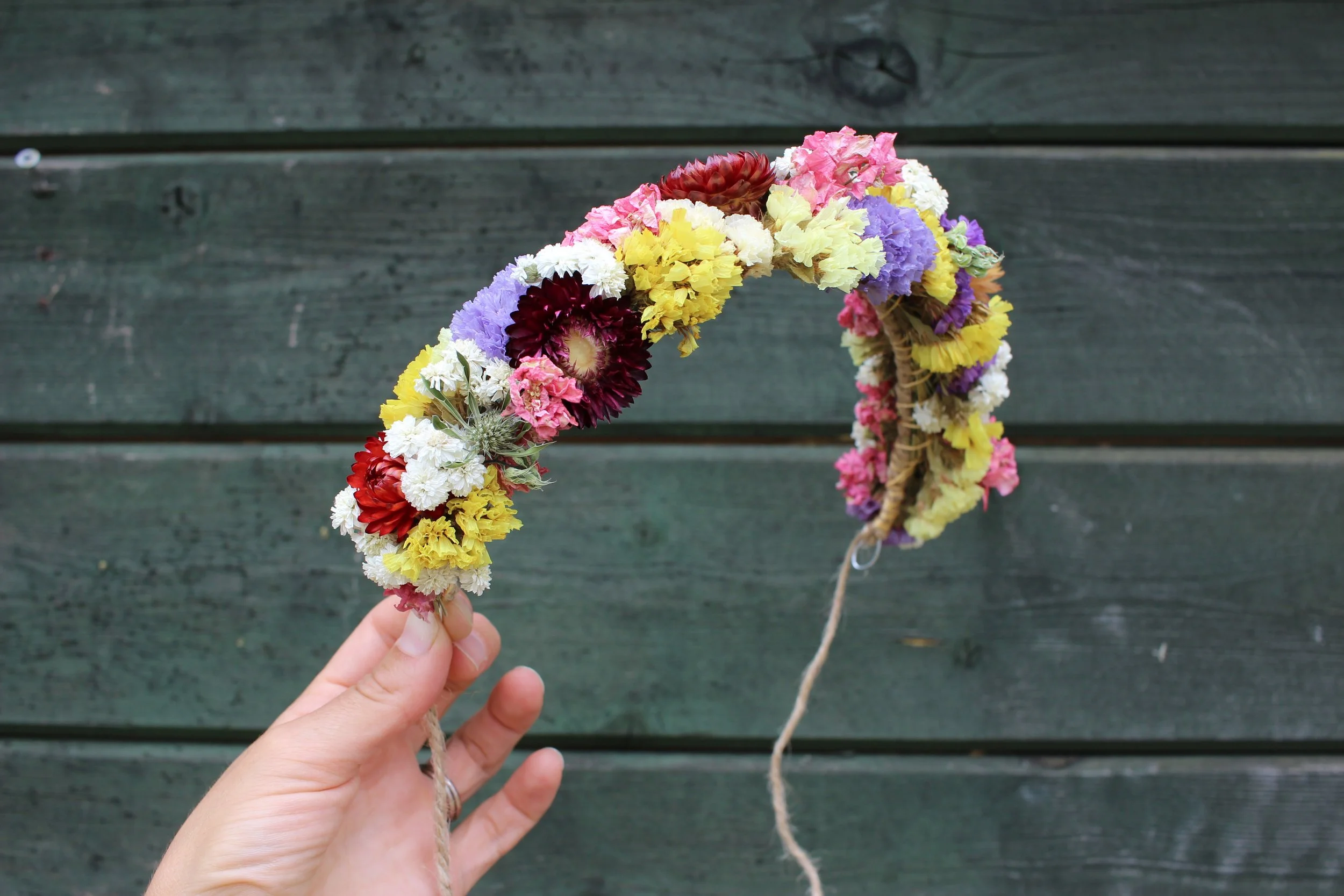 Bright and cheerful dried flower crown for a little one - perfect for summer parties and festival season! Handcrafted in my studio using a range of dried flowers including statice, achillea and larkspur, on a handmade wire and twine base.
