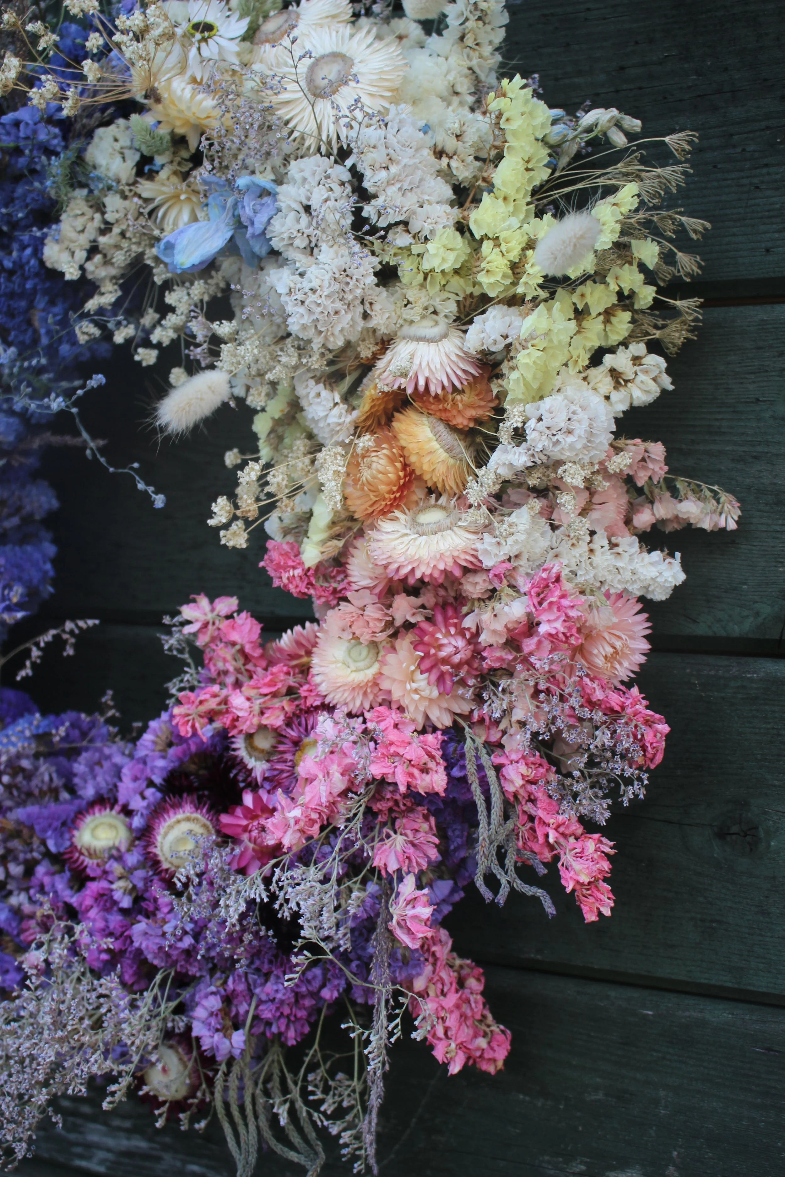 Gorgeous handcrafted everlasting wreath in a rainbow palette. Featuring forget-me-nots, eryngium, strawflowers, statice and a variety of other homegrown dried flowers and grasses.